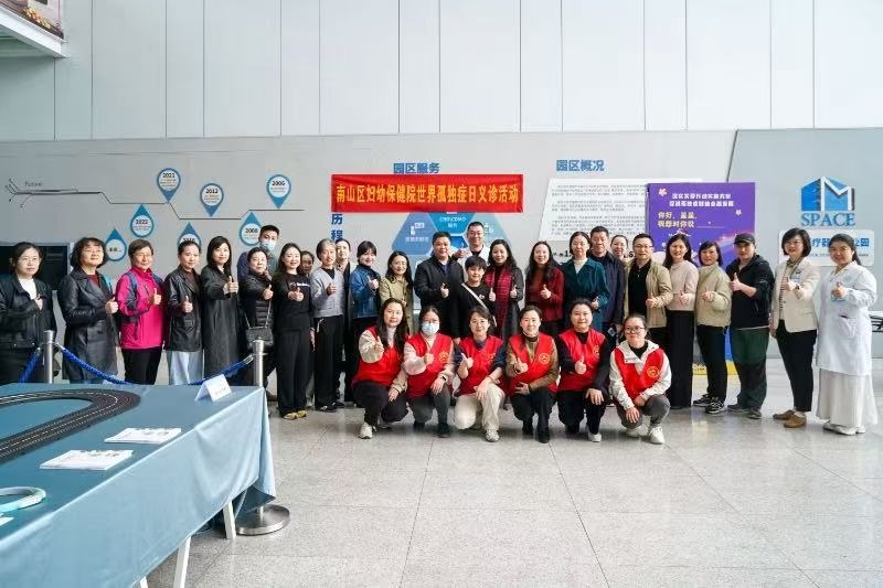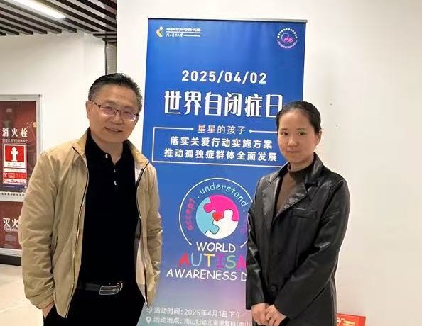 在2025年世界孤独症日来临之际,南山区妇幼保健院、南山区残疾人联合会、南山区各定点康复机构携手行动,围绕“落实关爱行动实施方案,促进孤独症群体全面发展”主题,开展系列活动,为孤独症群体撑起关爱保护伞。关爱中心代表在世界孤独症日宣传展板前交流,凝聚社会对孤独症群体的关注合力。